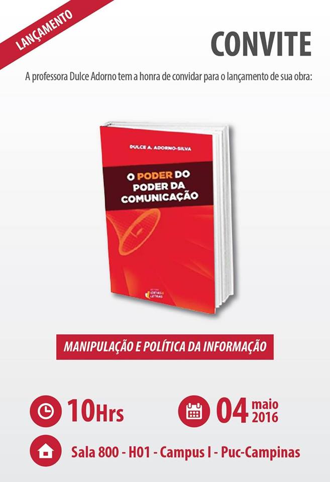 A professora doutora da Faculdade de Relações Públicas da PUC – Campinas, Dulce Adelia Adorno Silva, lançará amanhã, 04/05/2015, quarta-feira, sua obra: “ O poder do poder da comunicação”.