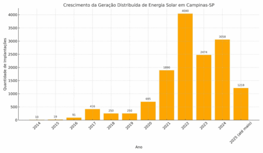 O uso da energia solar em Campinas aumentou mais de 30.000% entre 2014 e 2024. O salto expressivo reflete uma mudança profunda na matriz energética da cidade, acompanhada de impactos diretos na economia doméstica, no setor industrial e na ciência local. Dados da CPFL mostram que cerca de 92% das placas solares da cidade estão instaladas em residências. Com esse sistema, a redução na conta de luz pode chegar a 95%. Em média, uma casa que paga R$ 250 mensais em energia pode economizar aproximadamente R$ 2.850 por ano.