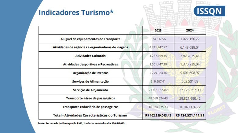 Segundo levantamento da Prefeitura, os indicadores do turismo apontam um crescimento de 21% na movimentação econômica do setor, passando de aproximadamente R$ 102 milhões em 2023 para R$ 124 milhões em 2024. Isso reforça a importância econômica do turismo para a cidade.