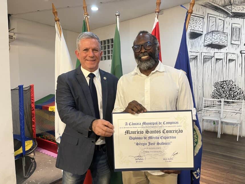 Faixa preta de jiu-jitsu e mestre de capoeira, o atleta Maurício Santos, mais conhecido como Mestre Azul, recebeu o diploma de Mérito Esportivo Sérgio José Salvucci, concedido pela Câmara Municipal por iniciativa do vereador Paulo Haddad. A solenidade, realizada na Casa de Portugal, em Campinas (SP), foi marcada pela emoção e reconhecimento pela contribuição relevante para o esporte no município.