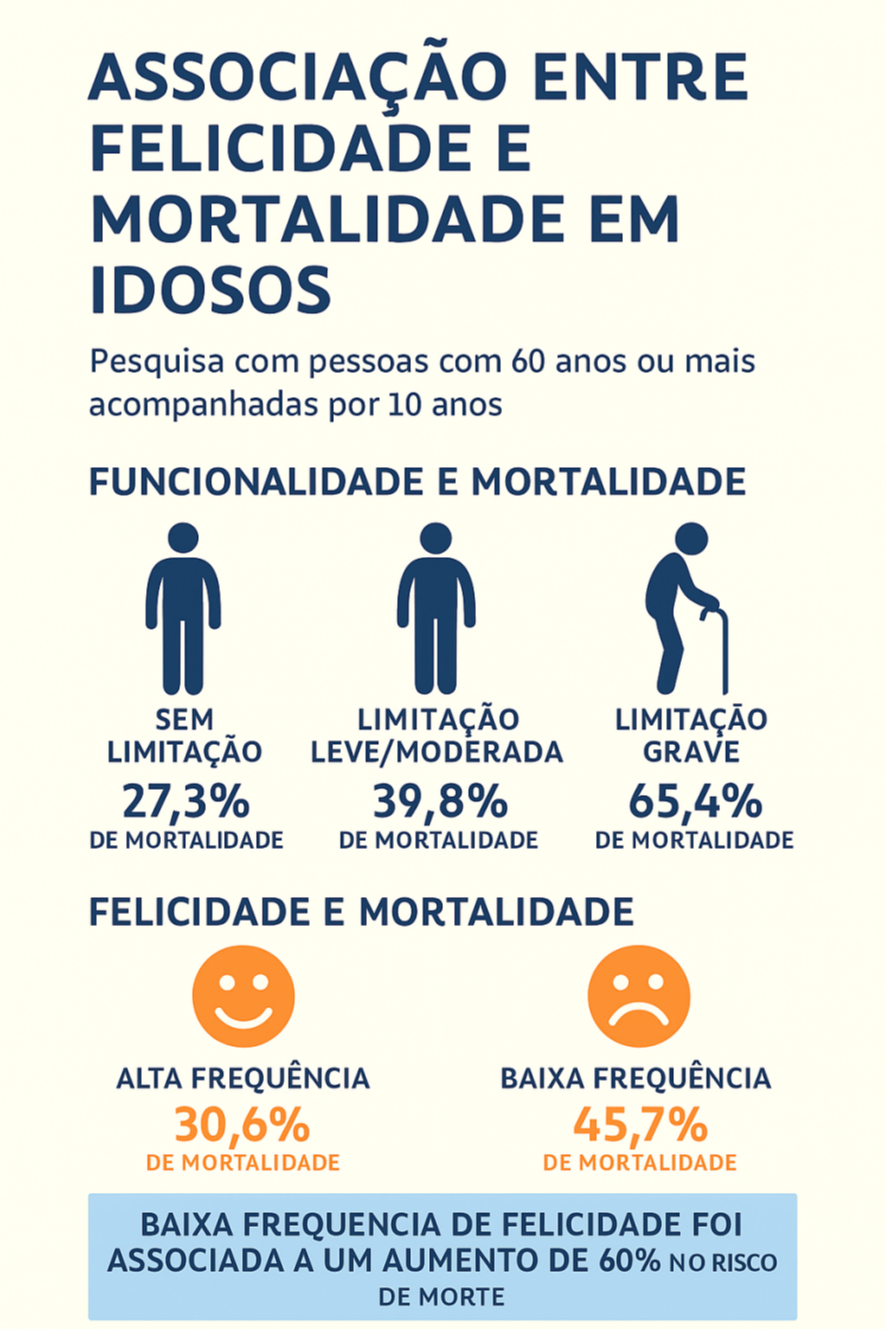 Além disso, limitações funcionais graves – como dificuldade para andar, tomar banho ou se vestir – aumentaram em quase três vezes o risco de morte. Apesar disso, o bem-estar emocional mostrou ter papel protetor: a felicidade reduziu em 14% a relação negativa entre limitações físicas e mortalidade. Em outras palavras, sentir-se feliz pode funcionar como uma espécie de “escudo” contra os efeitos do declínio físico.