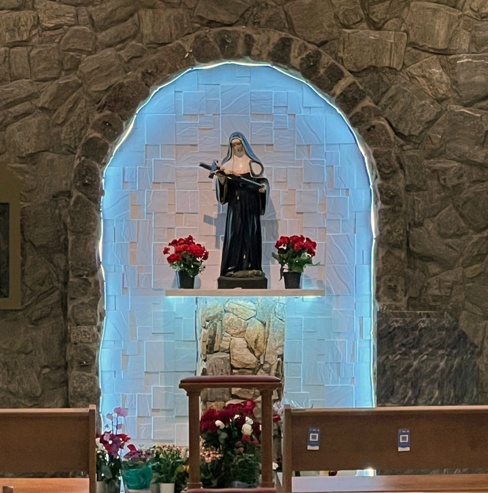 Imagem de Santa Rita de Cássia exposta no interior da igreja, em Indaiatuba