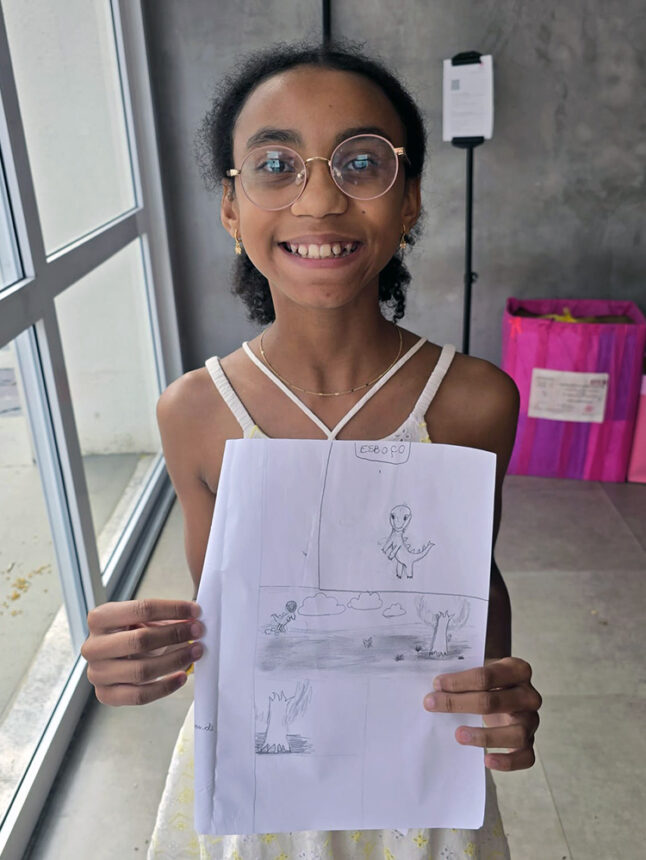 No outro dia foi a vez da oficina de histórias em quadrinhos, ministrada por Vinícius Scrochio. O foco esteve nos conceitos básicos de criação de personagens, cenários e narrativa, com atividades que alternavam explicações e prática. Assim como no sábado o ambiente era leve, com crianças rindo de suas próprias criações.