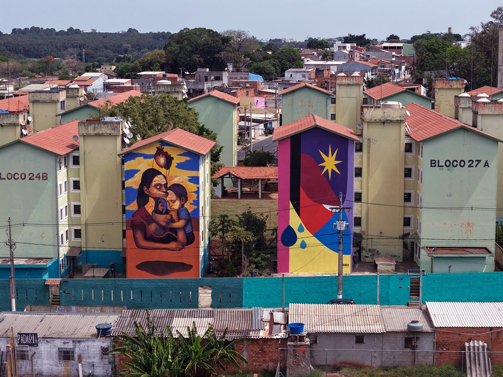 Os prédios do CDHU Padre Anchieta, em Campinas, acabam de ganhar uma nova cara: cores, geometrias e símbolos que transformam um conjunto habitacional comum em um mural de grande escala. A intervenção, parte do projeto Paisagem Urbana, foi apresentada ao público no dia 4 de outubro, acompanhada de projeções audiovisuais, vídeo imersivo e recursos de realidade aumentada. A obra, que já se impõe visualmente sobre as rodovias que cruzam o bairro reposiciona o território e afirma a potência da arte urbana como ferramenta de pertencimento.