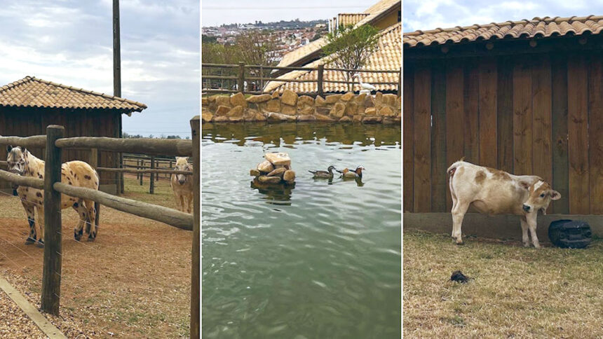 Pônei, jumento, marrecos mandarim e mini-vaca na fazendinha do Rancho Vô Luiz