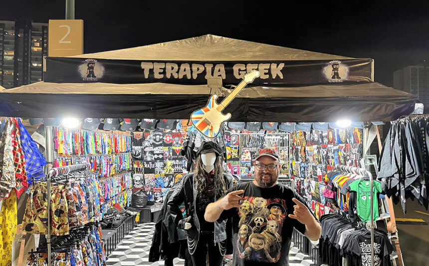 Além das comidas e bebidas, existe uma barraca de roupas, a Terapia Geek, que vende principalmente camisetas com estampas de bandas e músicos tradicionais do Rock. Adriano Carvalho, dono da loja falou da sua participação. “O evento é 100% rock and Roll, todas as bandas que tocam aqui são nesse estilo.” Adriano trabalha há algum tempo com o festival. “A gente está numa parceria já faz três anos e, desde que cheguei, percebi que se tornaria algo especial. O Burning Festival é uma família.”