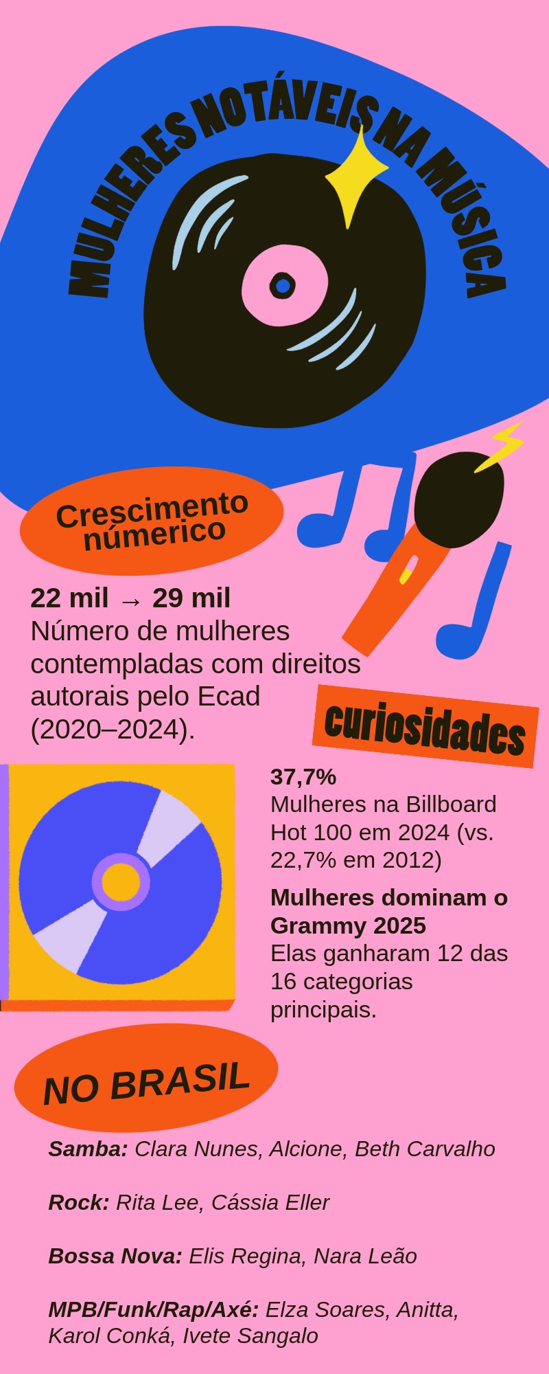 Essa mudança se reflete nos cenários global e nacional. No exterior, as mulheres representaram 37,7% dos artistas da Billboard Hot 100 em 2024, alcançando ainda mais visibilidade em premiações como o Grammy de 2025, onde dominaram 12 das 16 categorias principais. No Brasil, a presença feminina também se fortalece por meio de trajetórias marcantes. Nara Leão e Elis Regina na bossa nova, Elza Soares, Alcione e Clara Nunes na batida do samba, Rita Lee e Cássia Eller na força do rock e, atualmente, Anitta no funk pop.