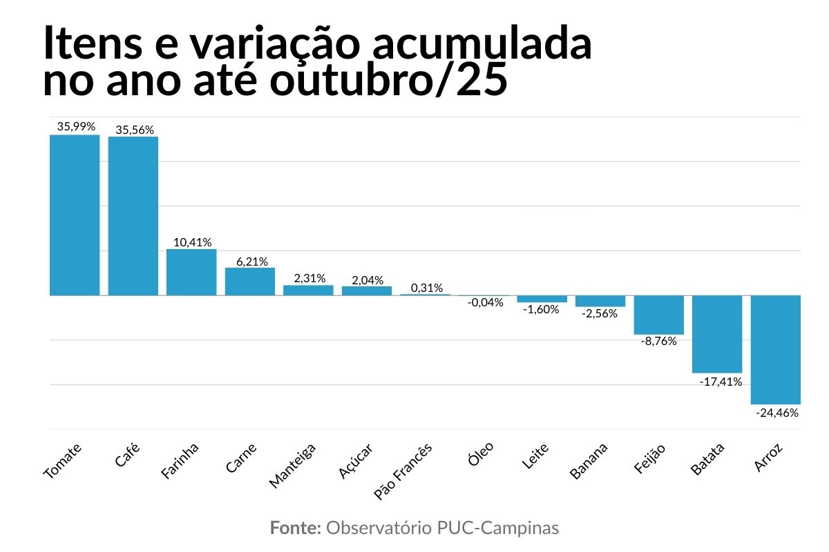 Ainda de acordo com o gestor, a queda do arroz e do feijão, em Campinas, ajudou a reduzir o custo do carrinho em outubro, embora a compensação não seja total diante de altas em outros itens, como tomate (+10,46%) e batata (+25,81%). “Batata e tomate possuem peso menor no orçamento alimentar médio, comparado com arroz e feijão. Ou seja, mesmo com aumento maior de preço, o impacto proporcional no carrinho ainda é mais limitado. A deflação de arroz e feijão cumpre um papel importante no impacto da cesta básica”, disse. Mesmo assim, ele indica que o faturamento não cresceu na mesma proporção do aumento de unidades vendidas, porque a queda de preço superou o ganho em volume.
