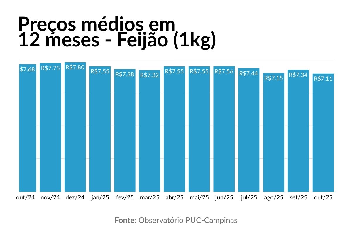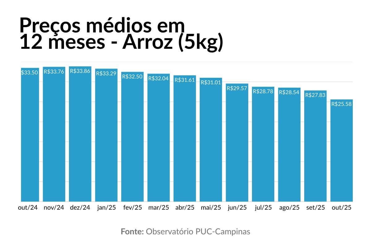 O arroz e o feijão aliviaram o bolso dos consumidores de Campinas em 2025, segundo levantamento do Observatório PUC‑Campinas. O arroz acumulou queda de 24,46% no ano até outubro, o feijão, de 8,76%. Com relação aos valores reais, o preço médio do pacote de 5 kg de arroz caiu de R$ 33,50 em outubro de 2024 para R$ 25,58 em outubro de 2025. Enquanto o quilo do feijão passou de R$ 7,68 para R$ 7,11 no mesmo período.