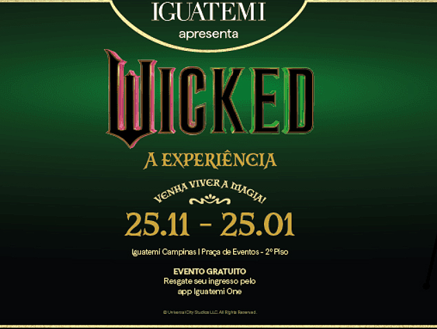 A atração imersiva Wicked – A Experiência, inspirada no universo do filme das Bruxas de Oz pode ser visitada gratuitamente. A mostra sensorial poderá ser visitada até o dia 25 de janeiro de 2026. A instalação recria cenários emblemáticos da história, como o quarto de Glinda, o laboratório da Universidade de Shiz, os corredores mágicos e o castelo da Cidade das Esmeraldas. O público poderá caminhar por ambientes tridimensionais com iluminações especiais, projeções e elementos interativos pensados para transportar os visitantes ao universo do musical.