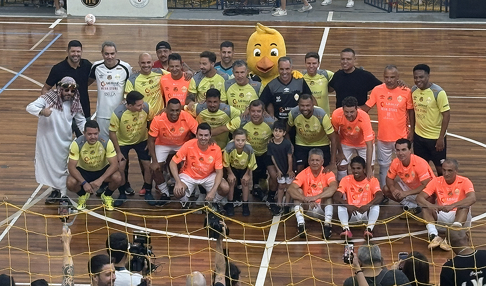 Ex-jogadores posando para foto antes do início da partida beneficente