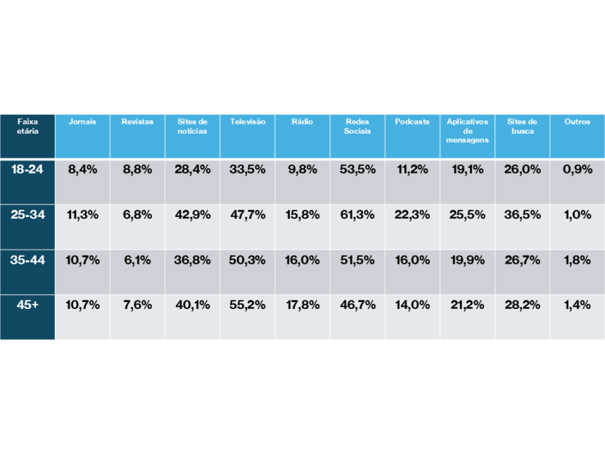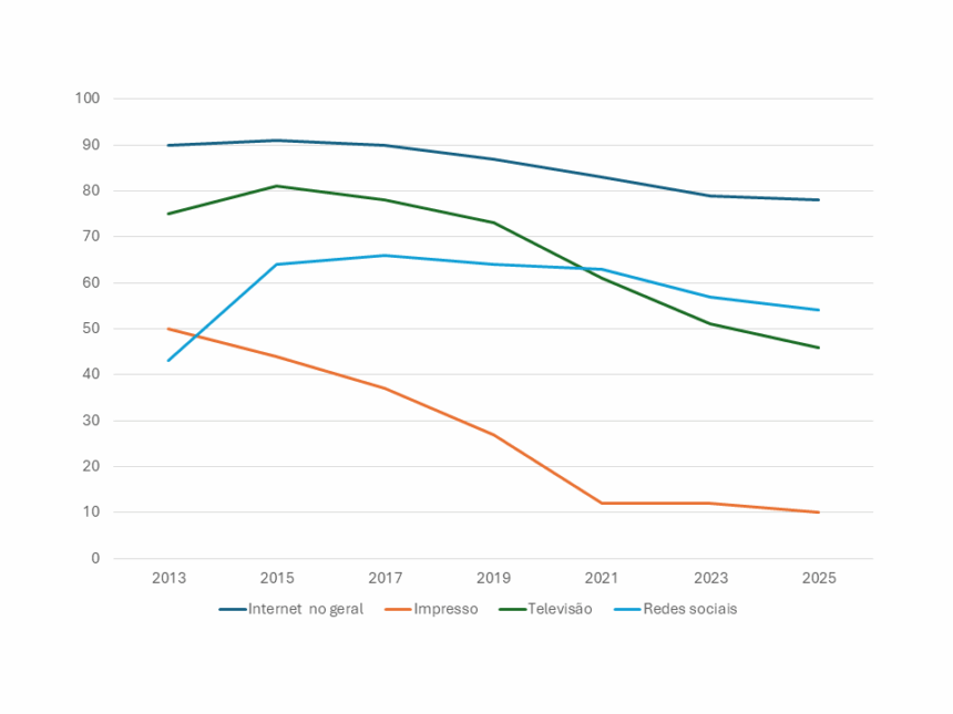 O relatório da Reuters Institute mostra que há uma queda no engajamento com fontes de mídias tradicionais, como TV, rádio, jornais, revistas e sites de notícias, enquanto a dependência das redes sociais aumenta.
