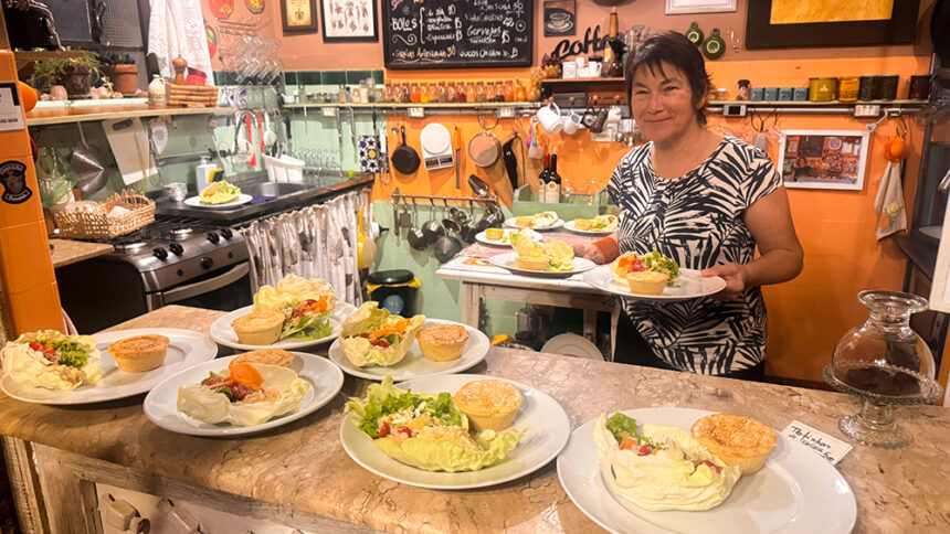 A proprietária Sandra Marques prepara e serve o jantar aos participantes após a sessão de cinema